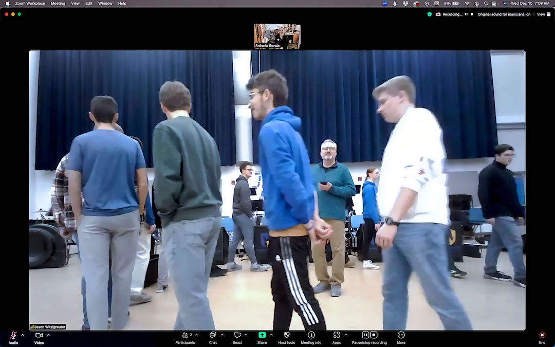 The class speaks swing eighth-note cross-rhythms while walking in half-notes (feet landing on beats two and four) around the drummer's swing groove. Photo credit: Jacob Fries,